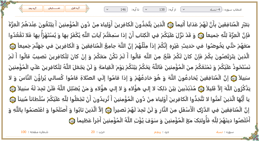 انگیزه منافقان از دوستی با دشمن: کسانی که کافران را به جای مؤمنانْ سرپرست و دوست خود می گیرند؛ آیا عزت و قدرت را نزد آنان می طلبند؟ یقیناً همه عزت و قدرت فقط برای خداست. (139)