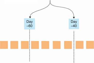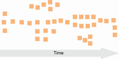 یک تکنیک کنترلشدهتر برای شروع جلسه، تسهیل چند رویداد اولیه است. به عنوان تسهیلکننده، از یک شرکتکننده بخواهید مثالی از یک رویداد بدهد و آن را روی جدول زمانی قرار دهد. سپس از شرکتکننده دیگری بخواهید یک رویداد متفاوت بدهد. در این حالت، من از شرکتکنندگان میخواهم که به رویدادهایی فکر کنند که در بخشهای دیگر جدول زمانی اتفاق میافتند، همانطور که در شکل زیر نشان داده شده است. به این ترتیب، افراد به کل فرآیند فکر میکنند و کل جدول زمانی روی دیوار را پر میکنند. فضای خالی بین رویدادها نشاندهنده این است که من انتظار دارم شرکتکنندگان شکافها را پر کنند و وارد جزئیات دامنه شوند تا اینکه در سطح بالا بمانند. پس از اضافه شدن چهار یا پنج رویداد اولیه، و زمانی که افراد میدانند یک رویداد دامنه خوب چیست، جلسه به اکتشاف آشفته تغییر میکند.