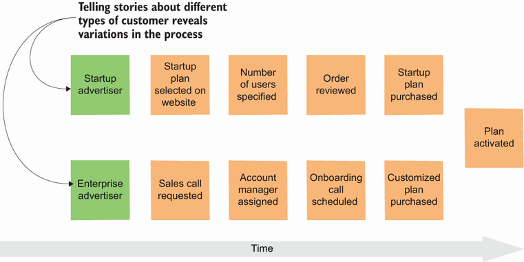 در هر دامنهی پیچیده، بسیاری از شاخهها وجود خواهند داشت که سناریوها و موارد حساس خاص مختلف را نشان میدهند. اغلب فرآیندهایی نیز به طور موازی اتفاق میافتند. برخلاف تکنیکهای دیگر، Event Storming نماد خاصی برای نشان دادن این مفاهیم ندارد. با این حال، آنها هنوز هم میتوانند به راحتی نمایش داده شوند. سادهترین رویکرد برای تجسم چندین سناریوی ممکن این است که یک مسیر خوشبینانه در جریان اصلی حفظ کنید و موارد خاص را به عنوان جریانهای افقی زیر جریان اصلی نشان دهید، همانطور که در شکل زیر نشان داده شده است.