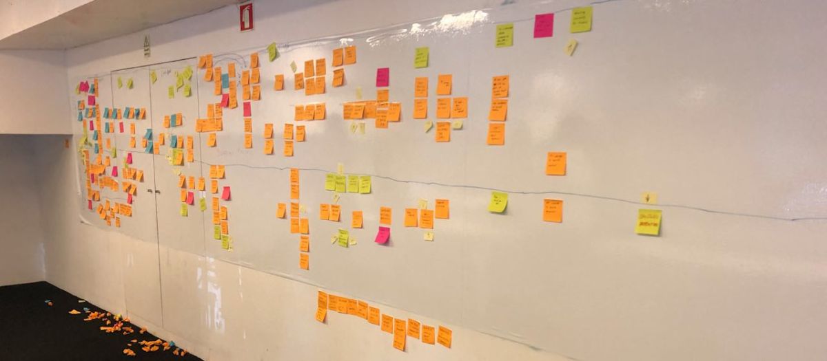 فرضیهی اصلی Event Storming ساخت یک جدول زمانی است که از چپ به راست با استفاده از رویدادهای دامنه، که از طریق یادداشتهای چسبنده نارنجی بیان میشوند، اجرا میشود. در حالی که برخی تکنیکها، مانند نقشههای سفر مشتری و نقشههای سرویس، بسیار ساختارمند هستند، رویدادگردانی انعطافپذیرتر است. با توجه به شکل زیر شما متوجه خواهید شد که، شاخههای مختلف و خوشههای به ظاهر تصادفی وجود دارند تا یک خط واحد از رویدادها که از چپ به راست اجرا میشوند. این ساختار به این دلیل است که Event Storming بر روی قرار دادن تمام اطلاعات مفید روی دیوار و نمایش پیچیدگی منحصر به فرد دامنه شما در هر شکلی که به طور تصادفی یا عمدی ظاهر میشود، تمرکز دارد. ثبت تمام جزئیات مهمتر از نظم است.