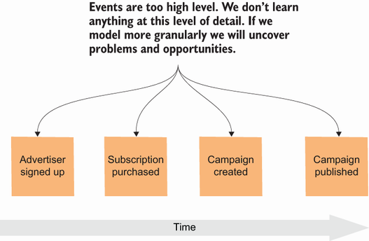 وقتی رویدادهای دامنه اطلاعات زیادی را انتزاع میکنند، تفاوتهای ظریف و مهم دامنه را پنهان میکنند. تصویر بعد دنبالهای از رویدادها را نشان میدهد که به نظر میرسد رویدادهای دامنه خوبی هستند. آنها روی یادداشتهای چسبنده نارنجی هستند، به زمان گذشته بیان شدهاند، و آنچه در دامنه اتفاق میافتد را توضیح میدهند تا اینکه خیلی فنی باشند، مانند کلیکهای دکمه و تراکنشهای پایگاه داده. با این حال، مقدار زیادی پیچیدگی توسط فقط چهار رویداد نشان داده شده است. در این سطح جزئیات چیز کمی برای یادگیری وجود دارد. چگونه میتوانیم فرصتهایی برای بهبود فرآیندهای ثبتنام، اشتراک یا ایجاد کمپینها شناسایی کنیم اگر هر کدام توسط یک یادداشت چسبنده پوشش داده شده است؟