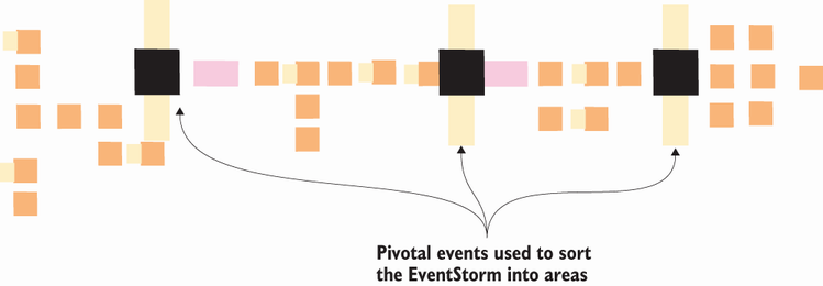 فقط خواستن از یک گروه برای مرتبکردن جدول زمانی کمی خوشبینانه است، بنابراین یک رویکرد ساختارمندتر میتواند مفید باشد. رایجترین رویکرد، رویدادهای محوری (Pivotal Event) نامیده میشود، که شامل تقسیم جدول زمانی به بخشهایی با استفاده از رویدادهای خاص به عنوان نقطه تفکیک بین مناطق مختلف، با استفاده از نوارهای زرد برای برجستهکردن آنها است. من همچنین رویدادهای محوری را بزرگتر و سیاه میکنم تا وقتی از راه دور کار میکنم،کاملا مشخص باشد.