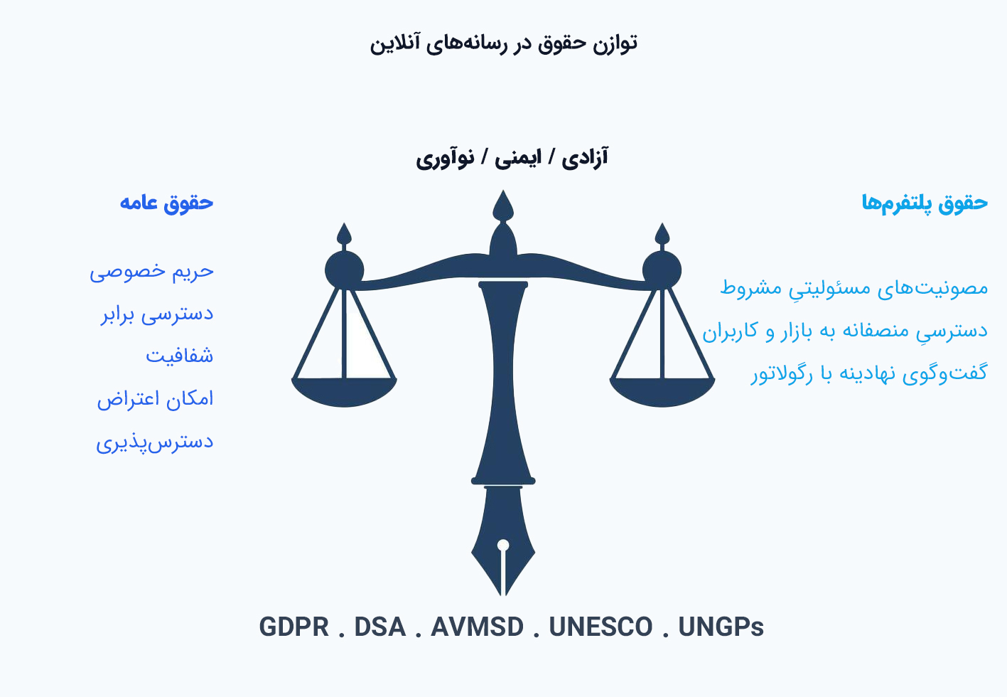 بررسی تطبیقی نشان میدهد که نظامهای حقوقی پیشرو، از جمله اتحادیه اروپا، چارچوبهای جامع و الزامآوری برای این توازن وضع کردهاند. مقررات حفاظت از دادههای عمومی (GDPR) حق کنترل کاربران بر دادههای شخصی را تضمین میکند؛ قانون خدمات دیجیتال (DSA) فرآیندهای منصفانه مدیریت محتوا، شفافیت الگوریتمی و مسئولیت متناسب پلتفرمها را تبیین میسازد؛ و دستورالعمل خدمات رسانههای دیداری _ شنیداری (AVMSD) نیز بر شفافیت هویتی، سهم محتوای بومی و دسترسپذیری تأکید دارد. در کنار اینها، «اصول راهنمای سازمان ملل در کسبوکار و حقوق بشر» و اسناد یونسکو در باب حکمرانی دیجیتال، بُعد فرامِلی و حقوق بشری این حوزه را برجسته ساختهاند.