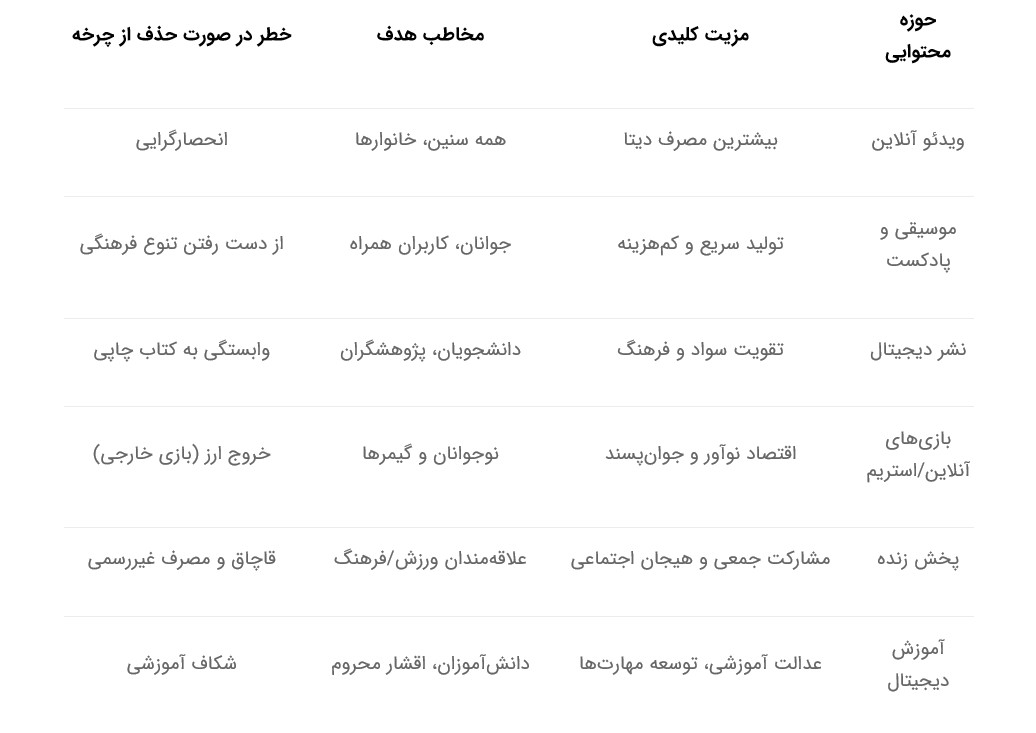 ارتقای مصرف محتوای داخلی: وقتی محتوای متنوع با کیفیت در دسترس باشد، کاربران ایرانی بیشتر به سمت محصولات داخلی گرایش پیدا میکنند.