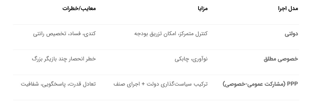 دولت نقش سیاستگذار، نظارتی و تنظیمگر را برعهده داشته باشد؛ وظایف اجرایی مانند تخصیص بودجه، ارزیابی عملکرد و مدیریت عملیاتی بر عهده تشکلهای تخصصی و بخش خصوصی باشد. این مدل در بسیاری از کشورها تحت عنوان PPP (شراکت عمومی-خصوصی) موفق عمل کرده است.