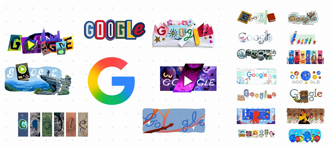 ویژگی: لوگوی گوگل شکل پایهای ثابتی دارد اما در مناسبتها (مثل تولد هنرمندان، رخدادهای جهانی) در صفحه اول جستجوگر گوگل تغییر میکند.