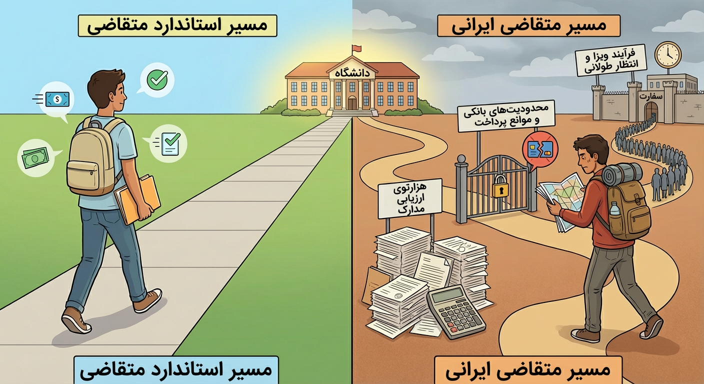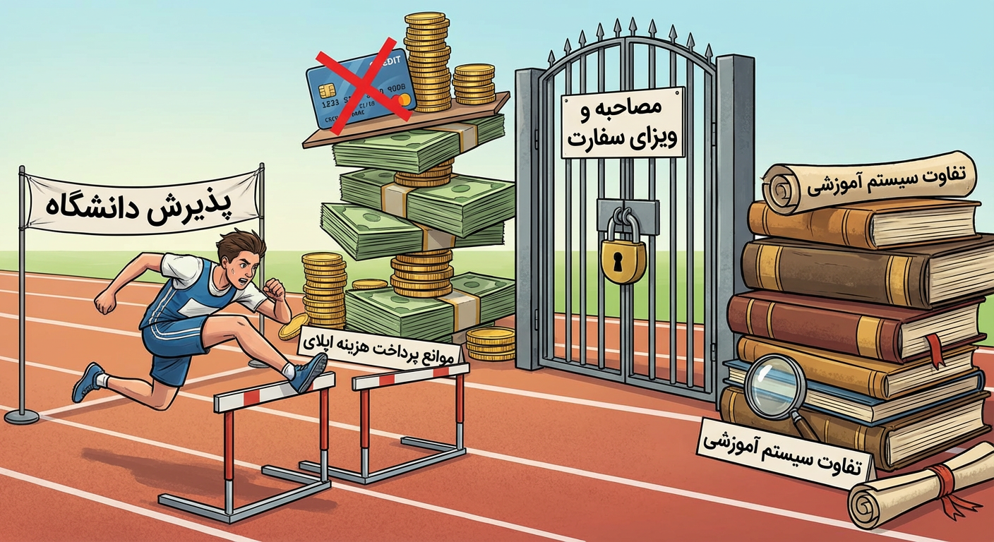 علاوه بر این، محدودیتهای بانکی و ارزی ایران، پرداخت هزینههای ثبتنام، آزمونهای بینالمللی مانند IELTS یا TOEFL، و حتی هزینههای اپلیکیشن دانشگاهها را به چالشی جدی تبدیل کرده است. در حالی که یک دانشجوی آلمانی یا هلندی با چند کلیک میتواند هزینه اپلای را پرداخت کند، دانشجوی ایرانی باید مسیرهای پیچیدهای را طی کند که خود نیازمند آگاهی و تجربه است.