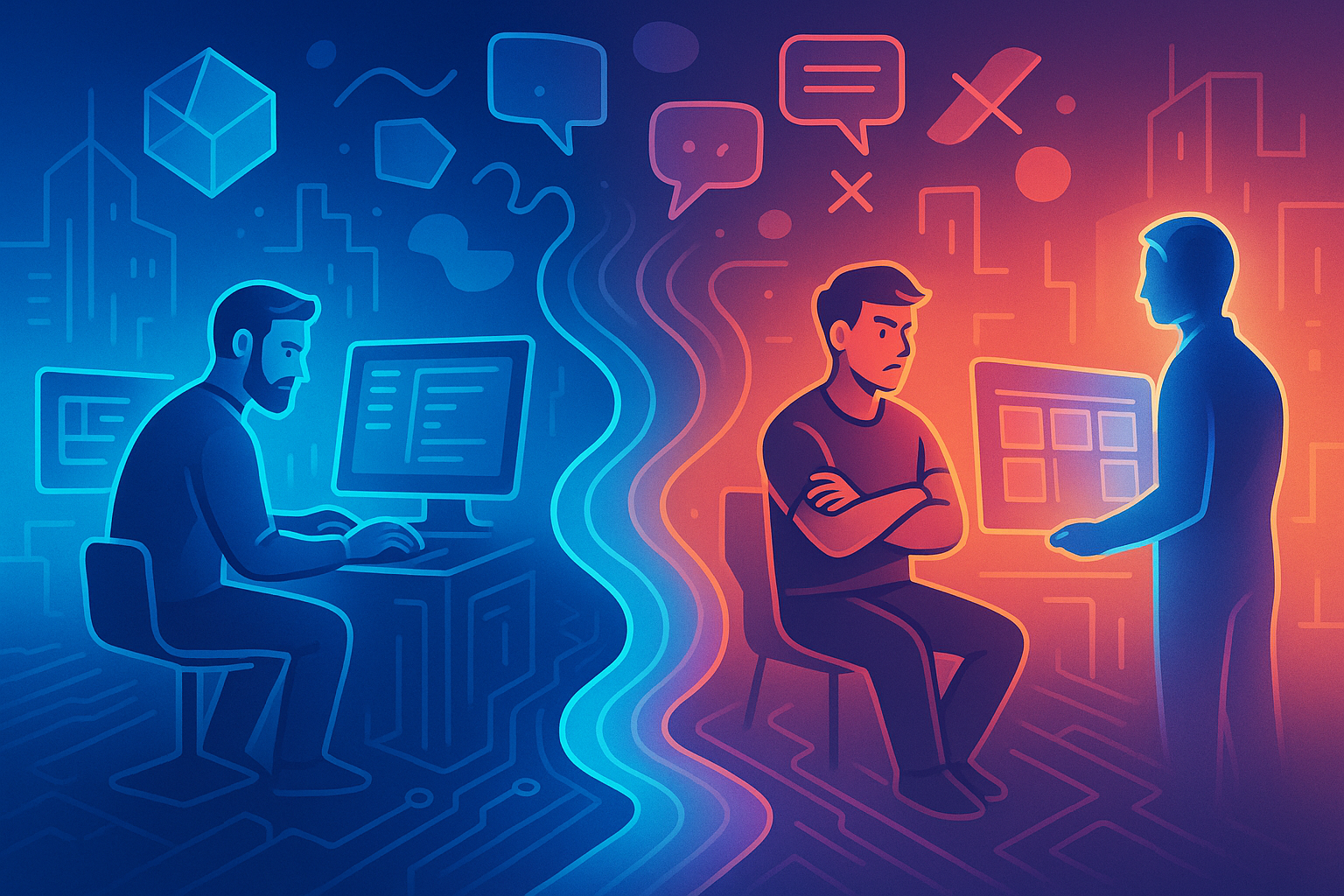در فضای باز یک دفتر کار مدرن، دو برنامهنویس در حالی که به مانیتورها خیره شدهاند، ناگهان گفتوگویی شروع میشود؛ با لحنی تند، طعنهآمیز و کمی تحقیرآمیز: