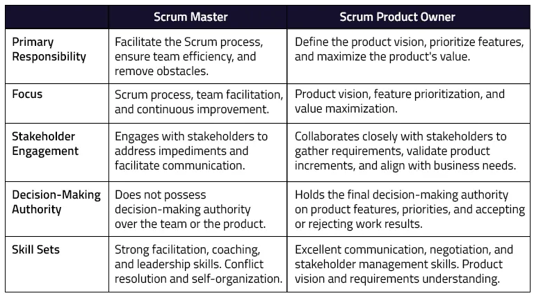 تمرکز و تخصص: نقش مالک محصول مستلزم درک عمیق چشم انداز محصول، نیازهای مشتری، پویایی بازار و ارزش تجاری است. آنها مسئول به حداکثر رساندن ارزش محصول و مدیریت بکلاگ محصول هستند. از سوی دیگر، اسکرام مستر بر تسهیل فرآیند اسکرام، مربیگری تیم و رفع موانع تمرکز دارد. با داشتن افراد اختصاصی در هر نقش، شانس بیشتری برای داشتن افرادی با تخصص و تمرکز لازم برای انجام موثر مسئولیت های مربوطه وجود دارد.