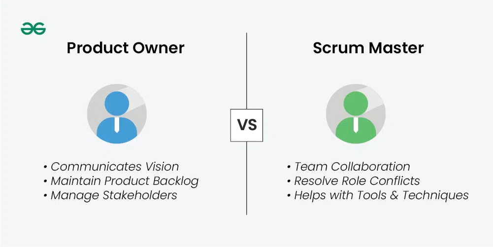 به طور کلی اسکرام گاید توصیه میکند که نقش های مالک محصول و اسکرام مستر را در یک تیم اسکرام نقش های جدا با وظایف تعیریف شده مستقل باشند (مالک محصول مدیر بکلاگ و اسکرام مستر مدیر پروسهها و تیم توسعه مدیر اسپرینت بکلاگ باشد.).
