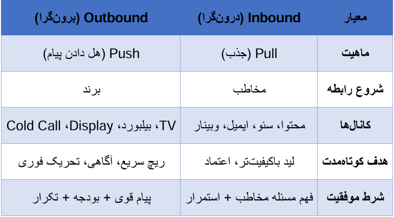 Outbound میره سمت مخاطب. Inbound کاری میکنه مخاطب بیاد سمت تو.