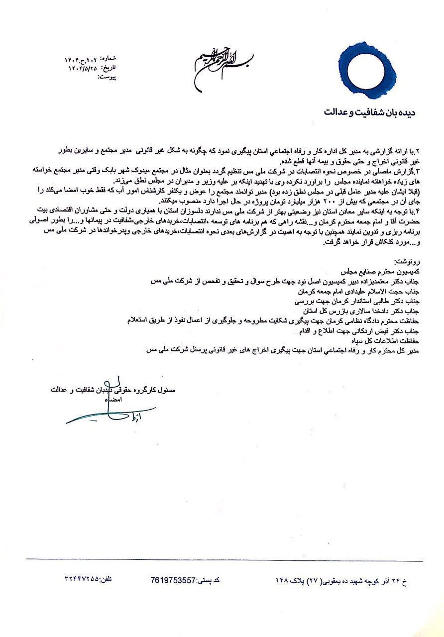 بر اساس اسناد تازهای که توسط «دیدبان شفافیت و عدالت» منتشر شده شرکت ملی مس ایران درگیر پروندههایی از سوءمدیریت هزینهتراشیهای غیرشفاف و اخراج مدیران سالم و افرادی که ماشین امضا نیستند و زیر بار امضاء به صورت چشم بسته برای رقمهای چند هزار میلیاردی نمیروند رقم خورده در این میان چند نفر بازنشسته سپاه در پست بازرسی ویژه در شرکت ملی مس آقایان جعفری، حسنزاده، کلهر که فاقد تخصص مرتبط هستند با توسل نابهجا و استفاده سوء از اسم سپاه که ربطی هم به این افراد ندارد به چشم میخورد و به دنبال ساختن حاشیه امن دروغین برای خود و اطرافیانشان هستند که در پروژههای چند هزار میلیاردی نقش داشته و بارها متهم به تهدید مدیران پاک دست و اعمال نفوذ و استفاده سوء جایگاه بازرسی را کسب کردند که نه تخصص و نه سابقه مالی و نه فنی در این حوزه را ندارند از عنوان نهادهای رسمی با ایجاد ارتباطات غیر متعارف و استفاده از اهرم استعلام هم برای پیشبرد برنامه بهره میبرند.