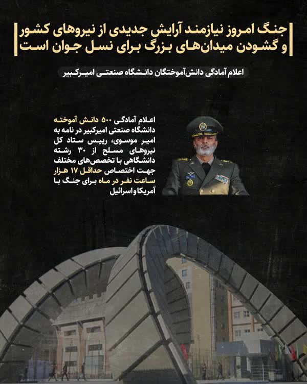🔹۵۰۰ دانشآموختۀ دانشگاه صنعتی امیرکبیر با ارسال نامهای به رییس ستاد کل نیروهای مسلح، آمادگی خود را برای اختصاص بیش از ۱۶ هزار ساعت نفر در ماه به نیازهای جنگ با آمریکا و اسرائیل اعلام کردند و بر لزوم آرایش جدید نیروهای کشور و گشودن میدانهای بزرگ برای جوانان تأکید کردند.