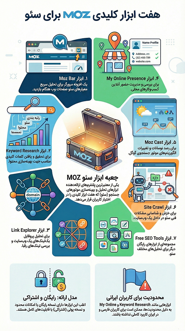 سایت MOZ بهطور کلی ۷ ابزار اصلی (رایگان و غیررایگان) در اختیار کاربران قرار میدهد. قبل از بررسی تکتک ابزارها، دو نکته مهم را باید بدانید: