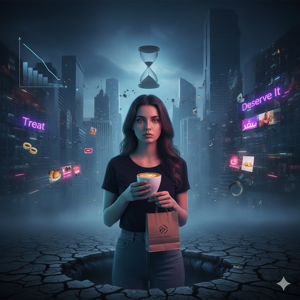 بیایید از یک آنالوژی برای درک بهتر این وضعیت استفاده کنیم: تصور کنید در هواپیمایی هستید که دچار تلاطم شدید است و احتمال سقوط (بحرانهای اقتصادی، جنگ، تورم) وجود دارد. مهمانداران (برندها) به جای تعمیر هواپیما، مدام به مسافران میگویند: «ماسک اکسیژن (Little Treat) خود را بزنید و آرام باشید.»