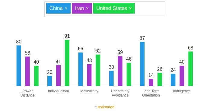 شاخص مرتبط دیگر Masculinity (نرینگی) است. ایران در این شاخص به مادینگی گرایش دارد و دو کشور دیگر هر دو نرینه هستند. هر چه جامعهای نرینهتر باشد به معنی آن است که ارزشهای جامعه توسط «موفقیت» تعیین میشوند، و مادینگی به معنی آن است که ارزشهای غالب، کیفیت زندگی و مراقبت از دیگران است. تفاوت ایران با آمریکا و چین از حیث اهمیت نظام خانواده است که در آن دو کشور قربانی منافع شخصی و موفقیت شغلی میشود، اما در ایران اینگونه نیست. یکی از مهمترین ویژگیهای نظام قانونی و اجتماعی ایران اهمیت بنیاد خانواده است. کتابهای متعددی راجع به وضعیت ناگوار زندگی در اردوگاههای کار اجبار کره شمالی و شوروی سابق نوشته شده که چند تایی را خواندهام. یک ویژگی برجستهی این جوامع شکستن هر نوع ارتباط خانوادگی و تقلیل آن تا حد مفاهیم مبتذلی مانند تولید و کار است که مدنظر مارکسیستهای انقلابی است. هم در روسیه و هم شرق آسیا خانواده اساسا یک واحد اقتصادی است ولی در ایران معنایی بسیار عمیقتر دارد.