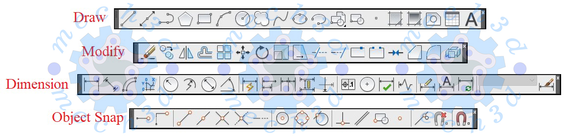 از دستور های موجود در این جعبه ابزار برای ترسیم موضوعات استفاده میشود. برای اجرای هر کدام از این دستورها میتوانید بر روی آیکن آن دستور در جعبه ابزار کلیک کنید یا اینکه از منوی Draw دستور مورد نظر خودتان را انتخاب کنید. همچنین میتوانید حرف یا حروف اختصاری یا خود دستور را به صورت کامل در خط فرمان تایپ کنید و بعد اینتر را بزنید تا دستور اجرا شود.