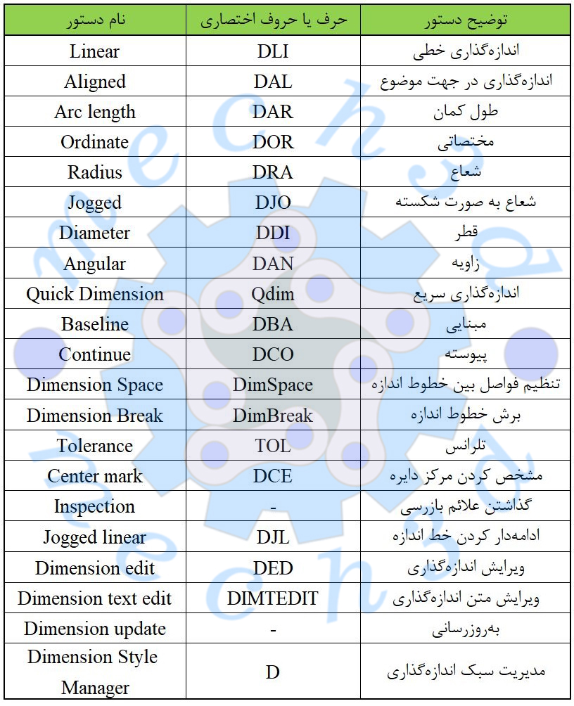 از این دستورها میتوانید برای اندازهگذاری ترسیمات خودتان استفاده کنید. جهت اجرای این دستورها میتوانید به منوی اندازهگذاری (Dimension) مراجعه کنید یا از جعبه ابزار آن استفاده کنید. همچنین میتوانید از حروف اختصاری این دستورها استفاده کنید. به دلیل اینکه اختصار دستورهای اندازه گذاری 3 حرفی هستند و به خاطر سپردن آنها کمی مشکل است، توصیه میکنم که از جعبه ابزار Dimension استفاده کنید.