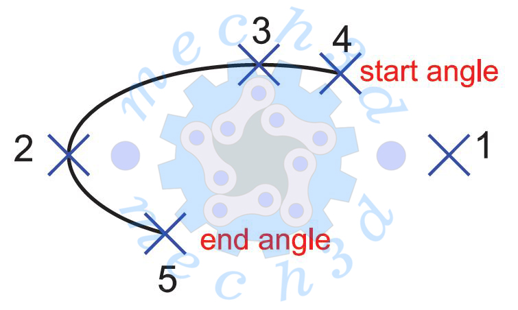 نکته بسیار مهم: باید دقت داشته باشید که زاویه یا نقطه شروع کمان دقیقا همان نقطه اول است. با توجه به شکل بالا، اگر بخواهید با زوایه دادن شکل بالا را ایجاد کنید، به جای مشخص کردن نقطه 4 زاویه اول را برابر 45 درجه و به جای مشخص کردن نقطه 5 زاویه دوم را برابر 225 درجه باید وارد کنید. حال اگر جای نقاط 1 و 2 بر عکس شود، اما زاویه های داده شده تغییری نداشته باشند شکل پایین ایجاد می شود.