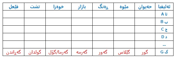 هفت ستون پیشنهادی برای بازی «اسم و فامیل» به زبان کوردی (کرمانجی)