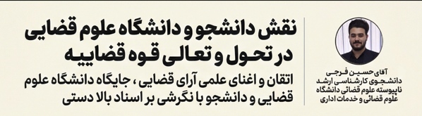 بر این اساس، نقش فعال، هدفمند و مسئلهمحور دانشجو و دانشگاه علوم قضایی، نه یک نقش حاشیهای، بلکه یکی از الزامات تحقق تحول و تعالی قوه قضاییه و ارتقای کیفیت تصمیمات و آرای قضایی محسوب میگردد.
