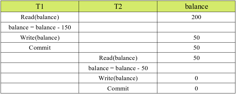 سیستم بانکی رو در نظر بگیرید که میشه توش موجودی یه حساب رو افزایش داد و یا از اون حساب برداشت کرد. حالا تصور کنید که شما یک حساب بانکی دارید که مبلغ ۲۰۰ هزار تومان موجودی دارد. شما یک خرید اینترنتی دارید و مراحل Checkout یک محصول رو داخل یک سایت انجام دادهاید و حالا رسیدهاید به مرحلهی پرداخت، قیمت این محصول ۱۵۰ هزار تومان هست. همزمان با این کار شما، خانومتون هم با کارت بانکیتون در حال خرید هست. شما مشخصات کارت بانکیتون رو تو درگاه پرداخت وارد میکنین و دکمهی پرداخت رو میزنین، تو همون لحظه خانومتون هم یه خرید به مبلغ 50 هزار تومان انجام میده و از کارت شما برای پرداخت استفاده میکنه. حالا دو درخواست کاهش اعتبار به سیستم بانکی رسیده، مراحلی که تو دیتابیس اتفاق میافتن به این شکله: