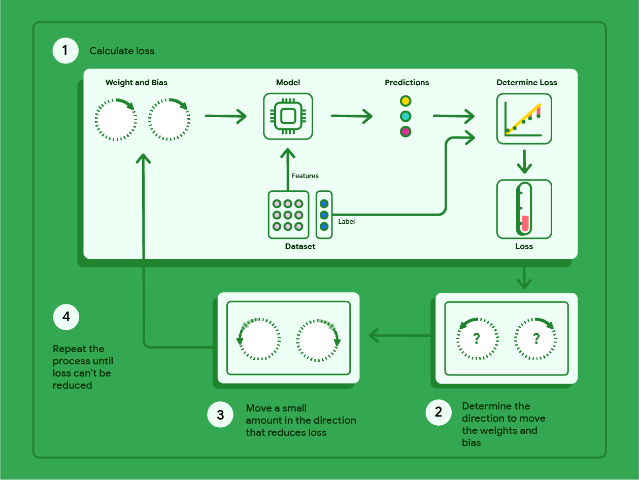 طرح زیر مراحل تکرارشونده گرادیان نزول که باعث پیدا کردن وزن ها و میزان تعصب با کمترین میزان زیان میشود را نمایش میدهد: