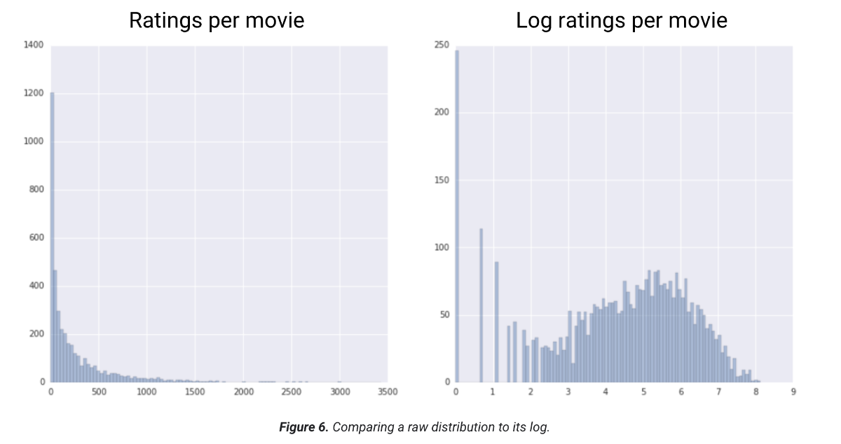 مقیاسبندی لگاریتمی زمانی مفید است که دادهها با توزیع قانون توانی مطابقت داشته باشند. به زبان ساده، توزیع قانون توانی به صورت زیر است: مقادیر پایین X، مقادیر بسیار بالایی از Y دارند. همانطور که مقادیر X افزایش مییابند، مقادیر Y به سرعت کاهش مییابند. در نتیجه، مقادیر بالای X، مقادیر بسیار پایینی از Y دارند. امتیازدهی فیلمها نمونه خوبی از توزیع قانون توانی است. در شکل زیر به موارد زیر توجه کنید: تعداد کمی از فیلمها امتیازهای کاربری زیادی دارند. (مقادیر پایین X، مقادیر بالای Y دارند.) اکثر فیلمها امتیازهای کاربری بسیار کمی دارند. (مقادیر بالای X، مقادیر پایین Y دارند.) مقیاسبندی لگاریتمی توزیع را تغییر میدهد که به آموزش مدلی که پیشبینیهای بهتری انجام میدهد، کمک میکند.