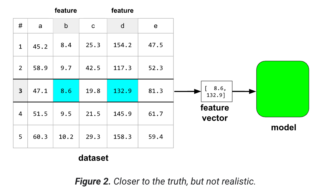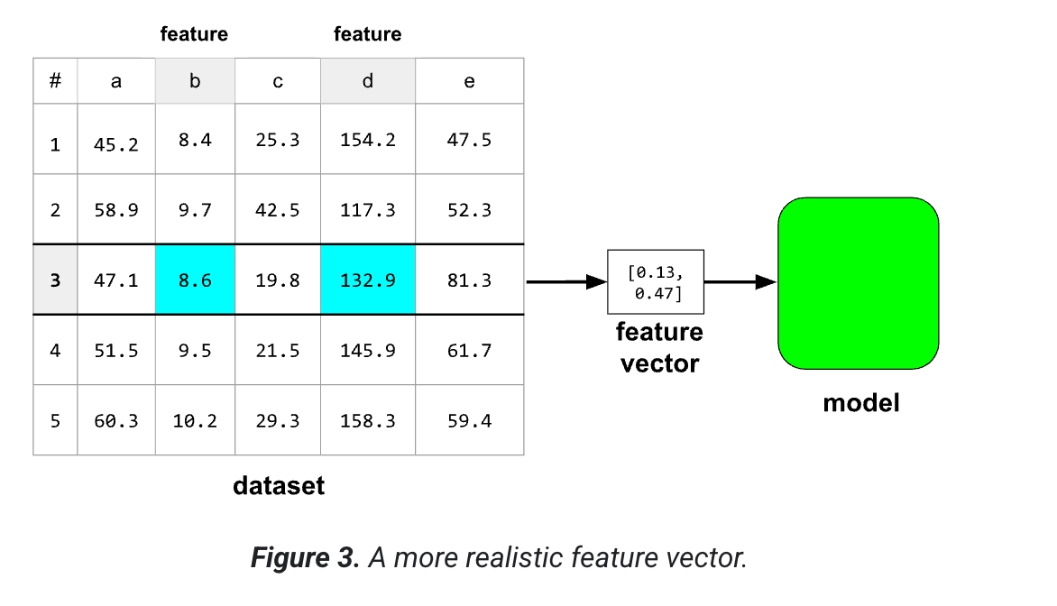 فرض کنید یک مجموعه داده شامل ۵ ستون است ولی فقط ۲ تا از ستون ها به عنوان ویژگی در مدل هستند. مدل یک آرایه ای از اعداد اعشاری به نام بردار ویژگی را هزم میکند. یک بردار ویژگی یک نمونه را میسازد.