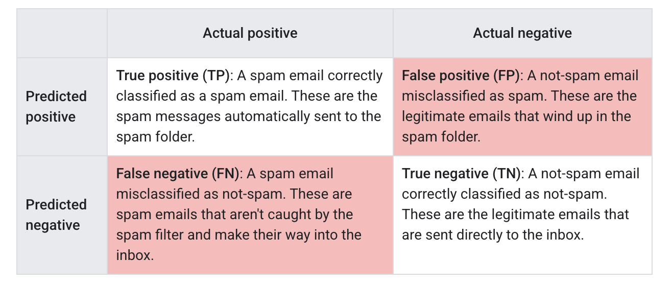 جواب احتمالی واقعیت نیست. این چهار احتمال اتفاق برای هر خروجی یک طبقه بندی کننده باینری است. برای طبقه بندی نمونه اسپم اگر جواب را سطر و شرایط را ستون در نظر بگیریم به جدولی میرسیم به نام ماتریس سردرگمی.