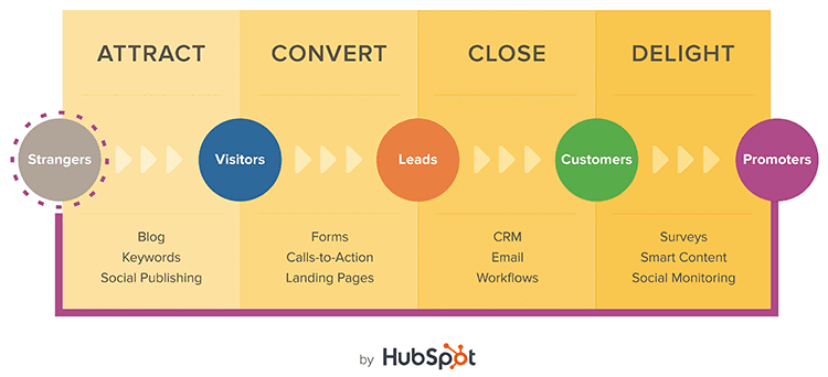 هدف بازاریابی سنتی فروش یک محصول است. جلوتر که میآییم، مکاتب بازاریابی روی خدمات مشتریان تاکید میکنند تا احتمال وفاداری مشتری را بالاتر ببرند. بازاریابی محتوایی اما پا را از این حدود فراتر گذاشته و هدف خود را ایجاد یک ارتباط بلندمدت با مشتری از طریق کمک کردن به او معرفی میکند. وقتی یک برند در بخش وبلاگ خود مقالههای کاربردی منتشر میکند، افراد جواب سوال خود را با کمک این مقالات پیدا میکنند. گرفتن جواب سوال و دیدن نام برند در بالای صفحه، ناخودآگاه باعث ایجاد حس خوب در مشتری نسبت به برند میشود. بازاریابی محتوایی روی همین جلب اعتماد تاکید ویژهای دارد. در حقیقت بازاریابی محتوایی میتواند در یک افق بلندمدت، یک بازدیدکننده را تبدیل به تبلیغکننده کند. هاباسپات، یکی از معتبرترین شرکتهای مارکتینگ در دنیا، مسیر تبدیل مشتری بالقوه به بالفعل را با استفاده از ابزارهای مختلف بازاریابی محتوایی به شکل زیر نشان میدهد.