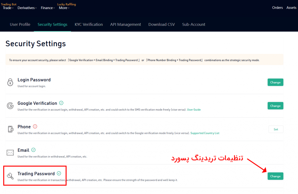 سپس در لیست تنظیمات، روی دکمه Change در مقابل Trade Password کلیک کنید.