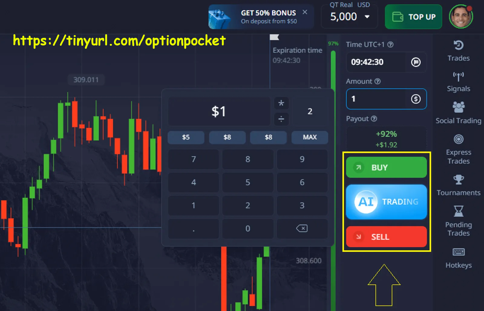 4. جهت حرکت قیمت را انتخاب کنید: خرید (بالا) یا فروش (پایین).