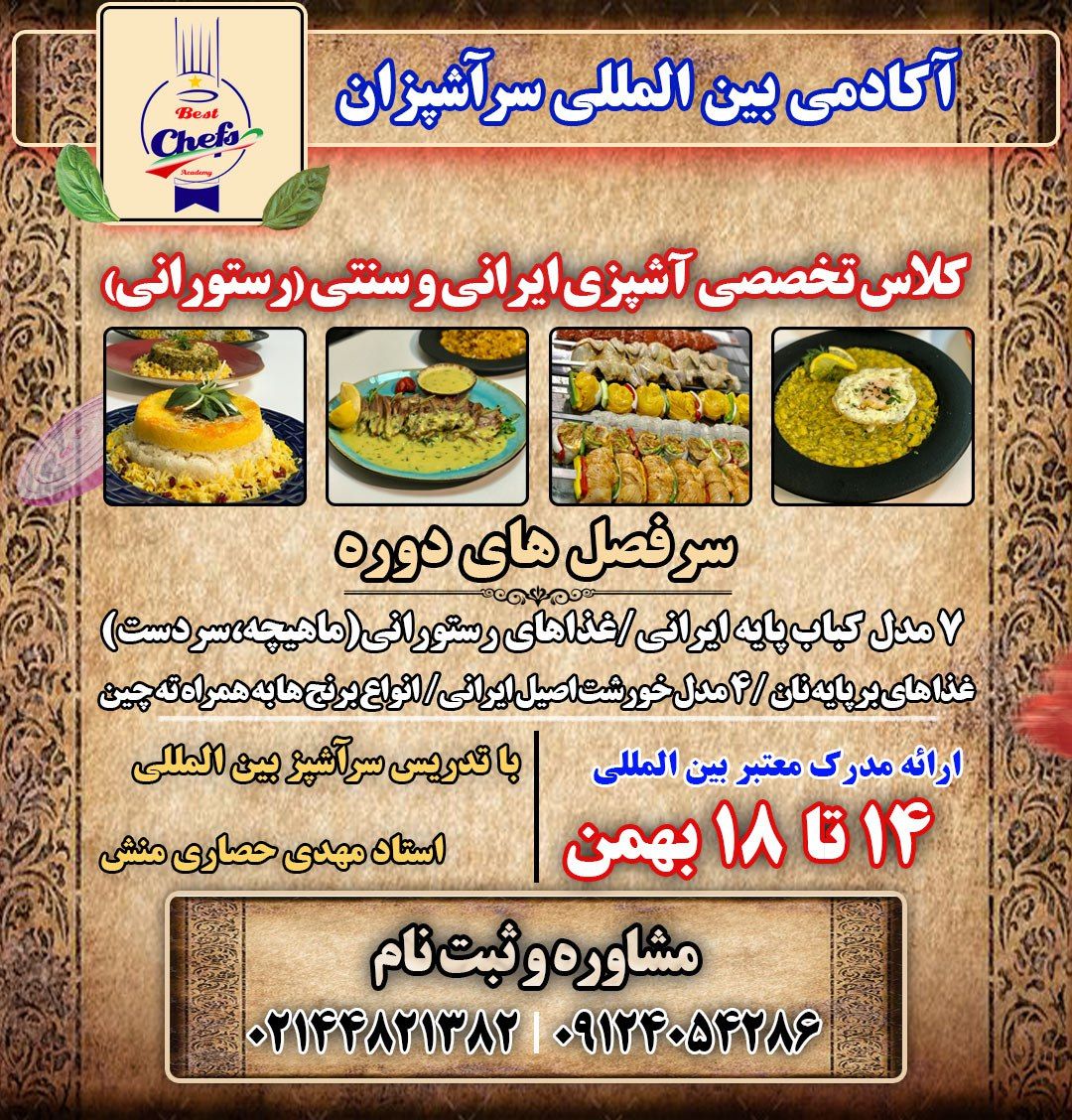برای اطلاعات بیشتر در مورد ای دوره روی "کلاس آشپزی آموزش غذاهای رستورانی، ایرانی و سنتی" کلیک کنید.