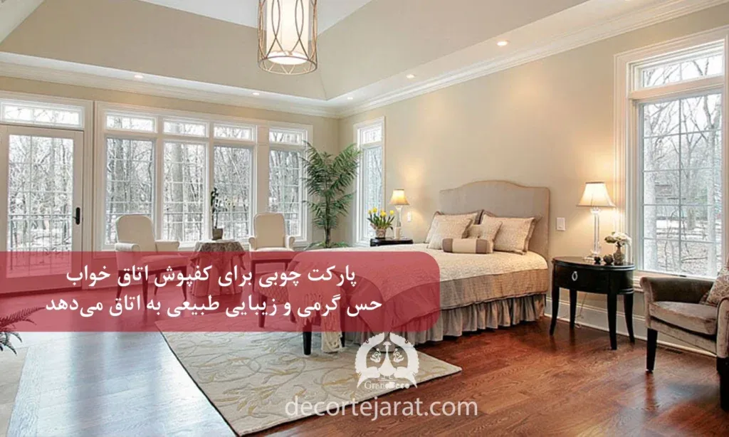 پارکت چوبی یا پارکت لمینت: این کفپوشها برای اتاق خواب مناسب هستند، زیرا علاوه بر زیبایی، در برابر صدا نیز عایق هستند و حس آرامش و راحتی را ایجاد میکنند.