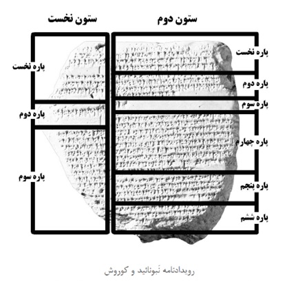 همه مردم بابل، همگی (مردم) سومر و اکد، (همه) شاهزادگان و فرمانروایان به وی (= کوروش) نماز بردند و بر دو پای او بوسه دادند (و) از پادشاهیاش شادمان شده، چهرهها درخشان کردند. . سروری که به یاری وی خدایان ِ در خطر مرگ (قرار گرفته) زندگی دوباره یافتند و از گزند و آسیب رها شدند، (و) همه خدایان به شادی او را همی ستودند و نامش را گرامی داشتند.