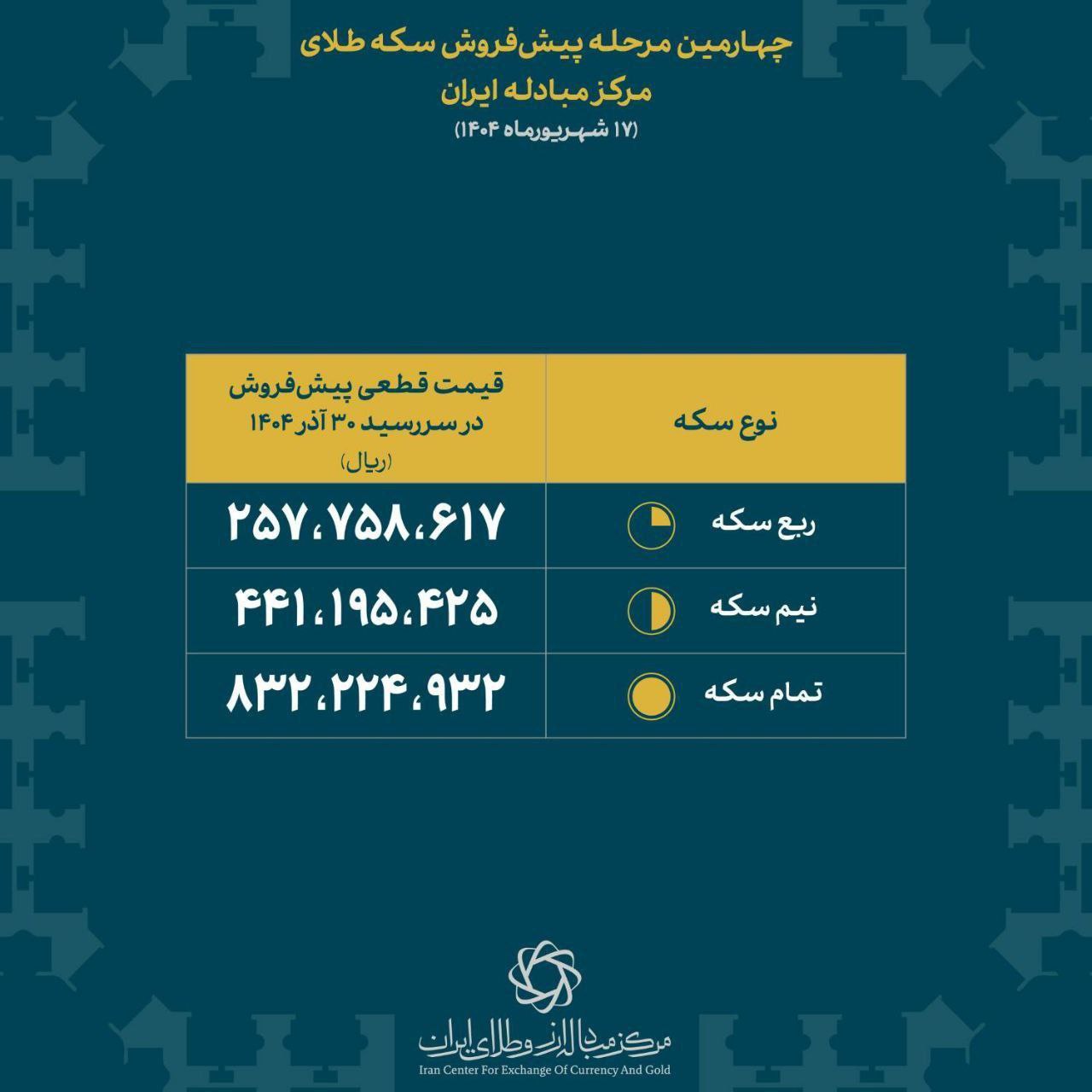قیمت انواع سکه طلای مرحله چهارم طرح پیش فروش بانک مرکزی با موعد تحویل ۳۰ آذرماه ۱۴۰۴ اعلام شد؛ این قیمت ها قطعی است.