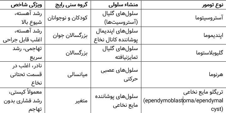 به نقل از سایت دکتر محمود یزدان پناهی جراح مغز و اعصاب و ستون فقرات: " تومورهای نخاع اینترامدولاری انواع مختلفی دارند که بسته به نوع سلولهای درگیر و محل رشد، علائم و روند درمان متفاوتی را ایجاد میکنند. شایعترین آنها آستروسیتوما و اپندیموما هستند که بیشتر در کودکان و جوانان دیده میشوند و معمولاً به آرامی رشد میکنند. در موارد نادرتری، گلیوبلاستومای نخاعی مشاهده میشود که ماهیتی تهاجمیتر دارد و روند پیشرفت سریعی دارد؛ همچنین گاهی هرنومای نخاعی که از بافت عصبی منشا میگیرد و تریگلو مایع نخاعی که از سلولهای پوشاننده بطنها و کانال مرکزی نخاع ایجاد میشود نیز در دسته تومورهای اینترامدولاری قرار میگیرند. شناخت نوع تومور از نظر بافتشناسی برای انتخاب روش درمانی مناسب بسیار اهمیت دارد و معمولاً از طریق MRI و نمونهبرداری مشخص میشود."