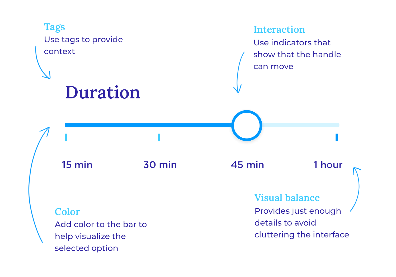 استفاده از نشانههای بصری برای بازه انتخابی: بازه انتخابشده باید به وضوح مشخص باشد. برای این منظور میتوان از رنگ یا سایهگذاری برای پر کردن فاصله بین دو دستگیره استفاده کرد تا انتخاب کاربر برجسته و قابل درک باشد.