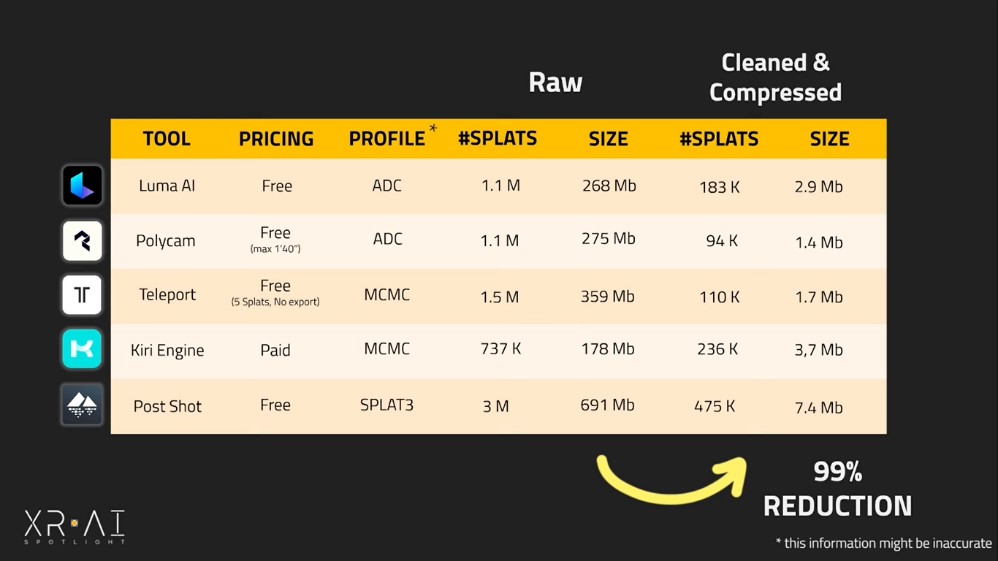 در مرحله بعد، با استفاده از نرمافزارهای مختلفی که امروزه در بازار وجود دارند، میتوان فرایند تبدیل این دادهها به Gaussian Splat را انجام داد. هر یک از این نرمافزارها ویژگیها، محدودیتها و کیفیت خروجی متفاوتی دارند. به همین دلیل، در جدول مقایسهای که در ادامه آمده، این ابزارها بر اساس معیارهای مختلف بررسی و با یکدیگر مقایسه شدهاند.