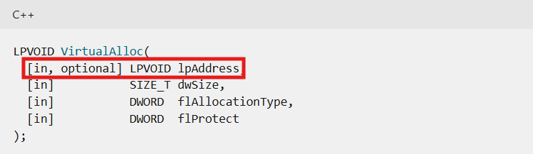 lpAddressمیتونهNULLهم باشه. در واقع با این پارامتر فقط یک آدرس پیشنهادی مشخص میشه، اگهNULLبدیم یا اون آدرس قبلا گرفته شده باشه، سیستم یک آدرس دیگه اختصاص میده.روش دقیقتر اینه که بذاریم