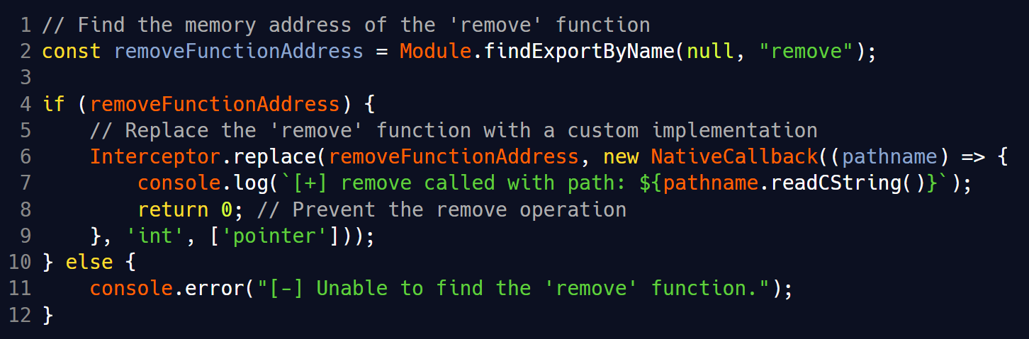 مقدار 0 رو return کردیم، چون وقتی این فانکشن فایل رو با موفقیت حذف کنه، مقدار 0 رو برمیگردونه. در خط 9، نوع داده رو int گذاشتیم چون مقدار برگشتی از نوع int هست و از pointer استفاده کردیم که به NativeCallback بگیم آرگومان ورودی رو باید به عنوان pointer مدیریت کنی. (البته اگه مستندات Frida رو در کنار مستندات فانکشنی که میخواین هوک کنید مطالعه کنید، تمام موارد بهطور کامل توضیح داده شده.)