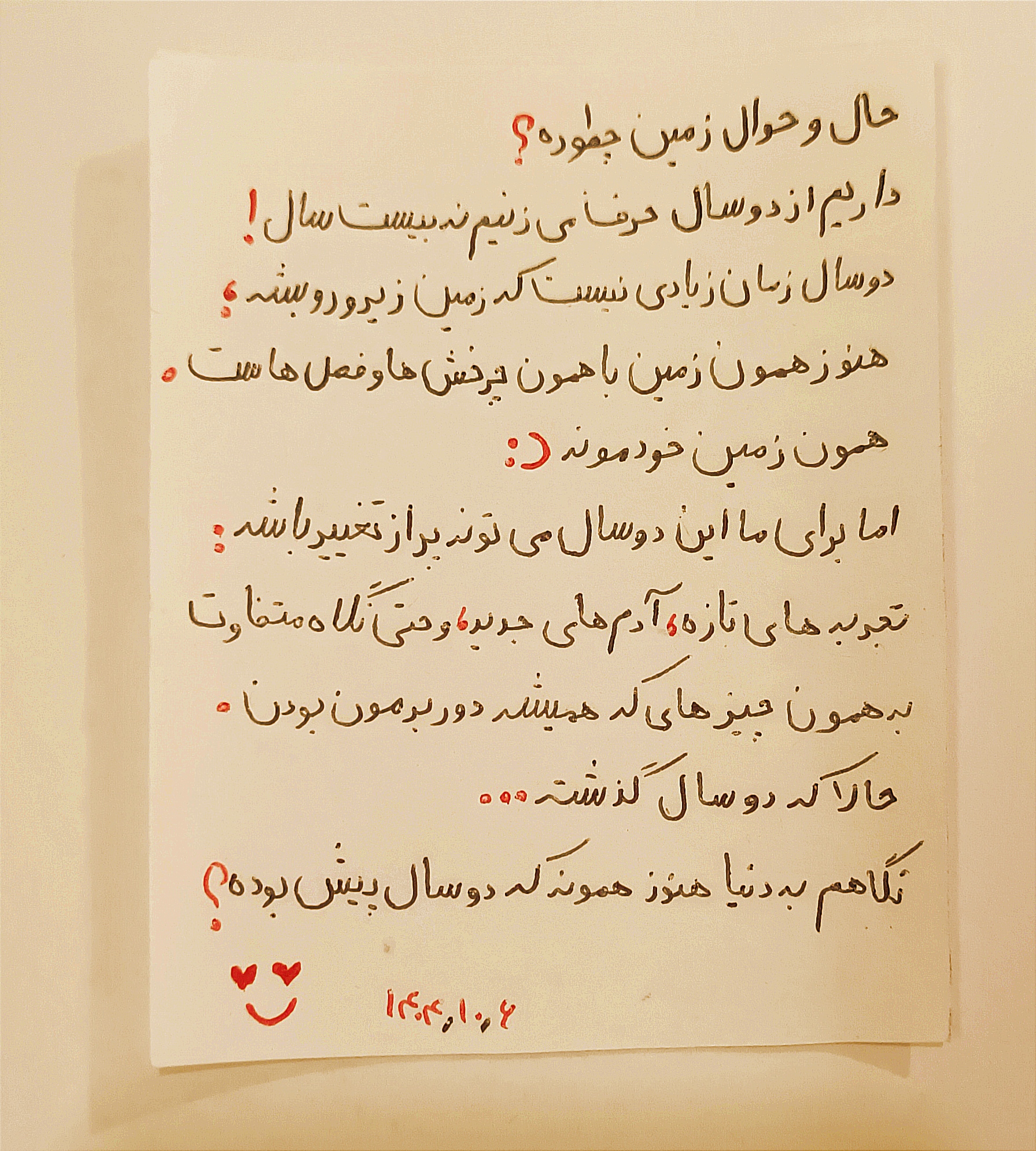 و در آخر ،خدا میداند که آیا دو سال دیگر در این دنیا حضور خواهم داشت یا خیر. با این حال، آرزو میکنم خانواده و عزیزانم در شادی و سلامت باشند و روزهایشان سرشار از آرامش گردد.