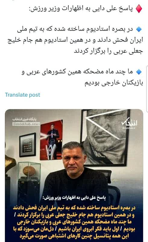 🔸از دلایل این انتساب هایش مثلا این است که مهدی تاج از این ورزشگاه دیدن کرده و گفته وای چقدر این ورزشگاه خوب ساخته شده است! (خودتان اباطیل مضحک ایران وایر را بخوانید که این کودن با مدرک لیسانس شریف به آنها رجوع کرده)