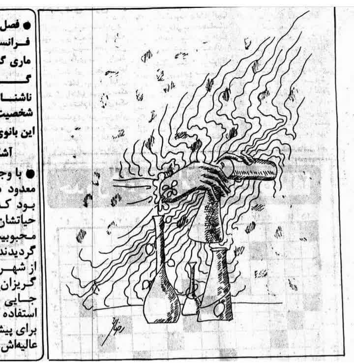 گفتم: صفحه گیر طرح توئه؛ گفت: یک کاریاش میکنم و شروع کرد طرحی دمدستی از وسایل آزمایشگاهی شیمی کشید و داد و کلاً خانم مادام کوری را از طرح حذف کرد. طرح را به آقای نصیری نشان دادم؛ فهمید که اینجور طرح کشیدن نوعی اعتراض است؛ اما چیزی نگفت و صفحه را امضا کرد."