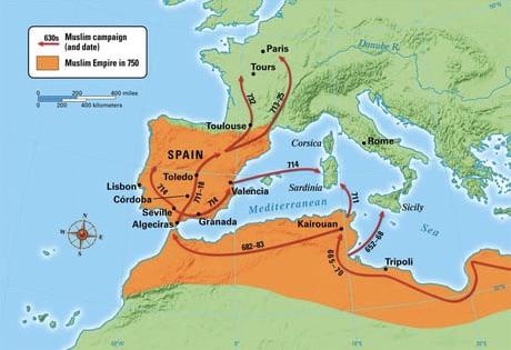 719 : اوج گسترش قلمرو اموی در ایبری ، تقریبا همه ایبری و بخشی از پیرنه شامل ناربون در کنترل خلافت است