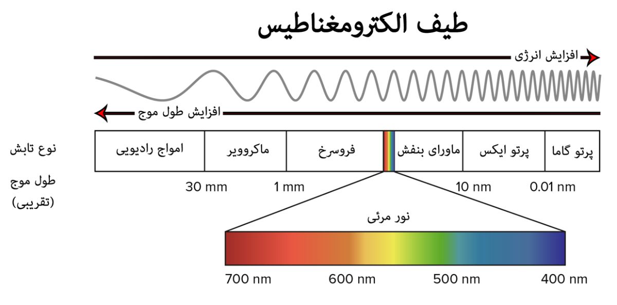 چشم ما به این نوع نور حساس نیست ولی پوست ما به صورت گرما حسش میکند. طول موج صوت تُن صدایی که میشنویم را تعیین میکند، طول موج نور رنگی را که میبینیم را مشخص میکند، وقتی نور در فضا حرکت میکند همه رنگهای آن با یک سرعت حرکت میکنند اما وقتی با یک زاویه به یک شیشهای میخورد سرعت نور کممیشود و تغییر جهت میدهد و درون منشور هر نور با سرعت متفاوتی حرکت میکند. در شیشه نور بنفش که کوتاهترین موج قابلمشاهده را دارد بیشتر از نور قرمز کُند میشود که بیشترین طول موج را دارد. این تغییرات سرعت رنگها را از هم تفکیک میکند، موجهاشون را با کمی اختلاف زاویه پخش میکند. اما در نور چیز دیگری هم حمل میشود یعنی اثرات عناصر بر روی نور خطوطی را برجای میگذارد که اثر آن عناصرست و از آن طریق میتوانیم که عناصری که در منبع نور وجود دارد را تشخیص دهیم(از این طریق الان میدانیم ستارهها از چه عناصری تشکیل شدند.)