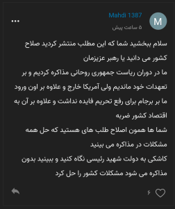 برای اخرین نفر هم میرسیم به ایشون بنده کمی با حرفای ایشون موافقم بله دولت اقای رئیسی کمی منطقی تر بود و خب دلایل زیادی داشت مثلا ایشون مقابل ترامپ نبود و صرفا یک شخصی مثل بایدن که اقتصاد امریکارو خراب کرد مقابلش بود،اما موضوع اشتباهه این هست که دوستان فکر میکنند برجام مذاکره بوده.