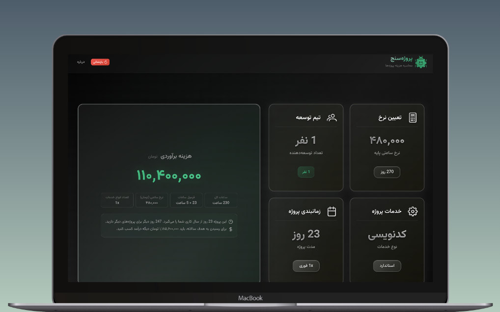 برای سادهتر شدن کار، من یک ابزار آنلاین به اسم پروژهسنج طراحی کردم. کافی است وارد سایت زیر بشین، نرخ پایه ساعتی و ضریبهای پروژه (مثل پیچیدگی، تعداد نفرات و مدت زمان) را مشخص کنید، تا در چند ثانیه هزینه کل پروژه برایتان محاسبه شود