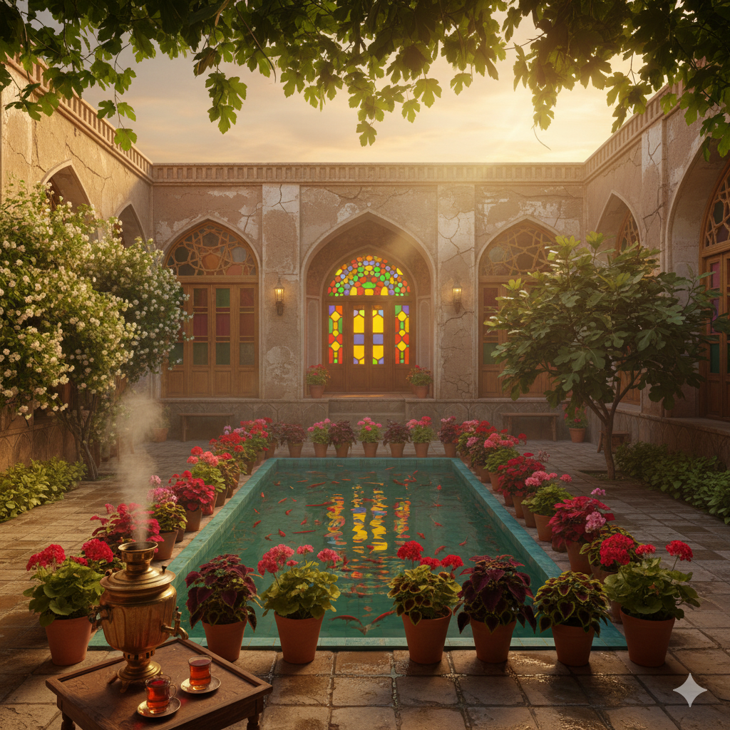 زیر سایهی لرزان درخت انگوری که بر داربست بالا رفته بود، گلدانهای شمعدانی با گلهای سرخ و صورتی، در کنار گلدانهای حسن یوسف با برگهای مخملی رنگارنگ ، کنار حوض آبی چیده شده بودند و صدای دلنشین آبنما، تنها موسیقی آن روزها بود.